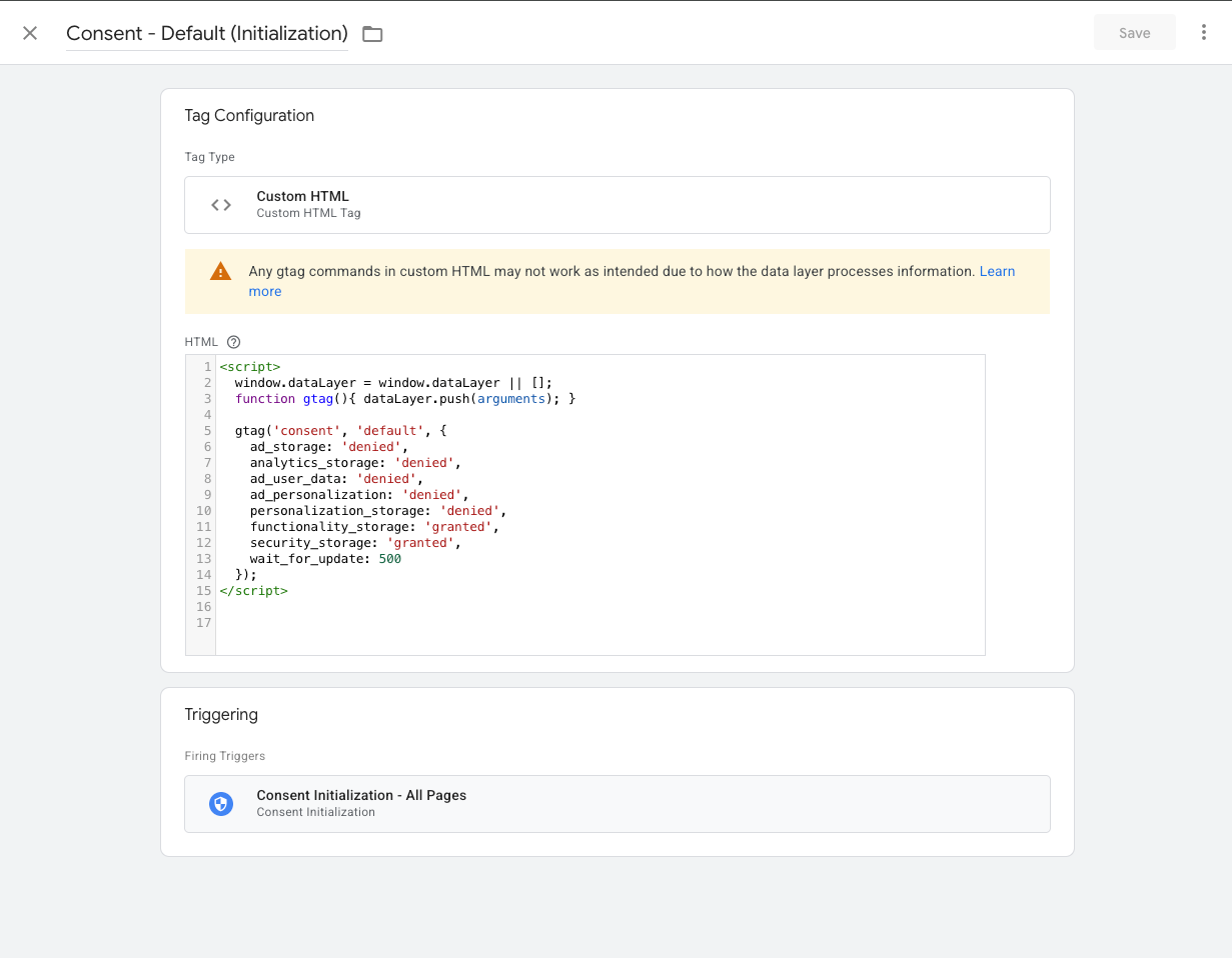 This tag must fire before everything else inside GTM. Combined with the head script, it ensures analytics is fully blocked until real consent is granted.