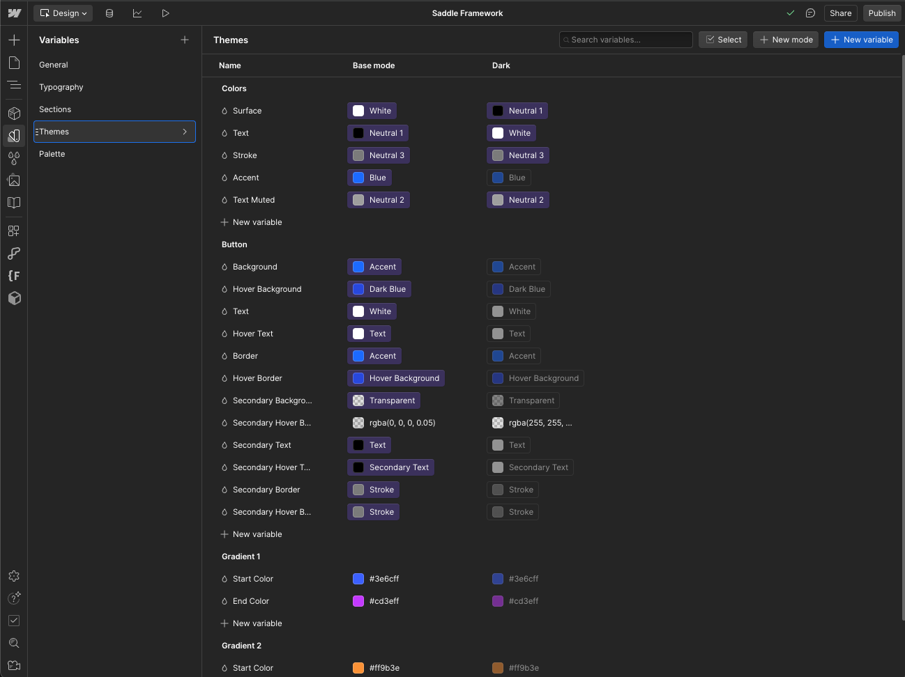 color variable can have a value for Light Mode and a different value for Dark Mode. - Switching the site mode instantly updates every element linked to that variable.
